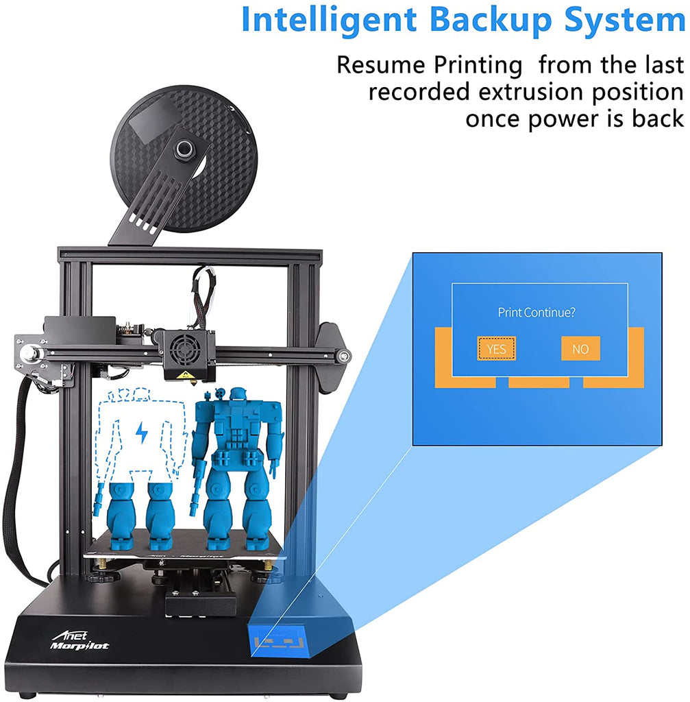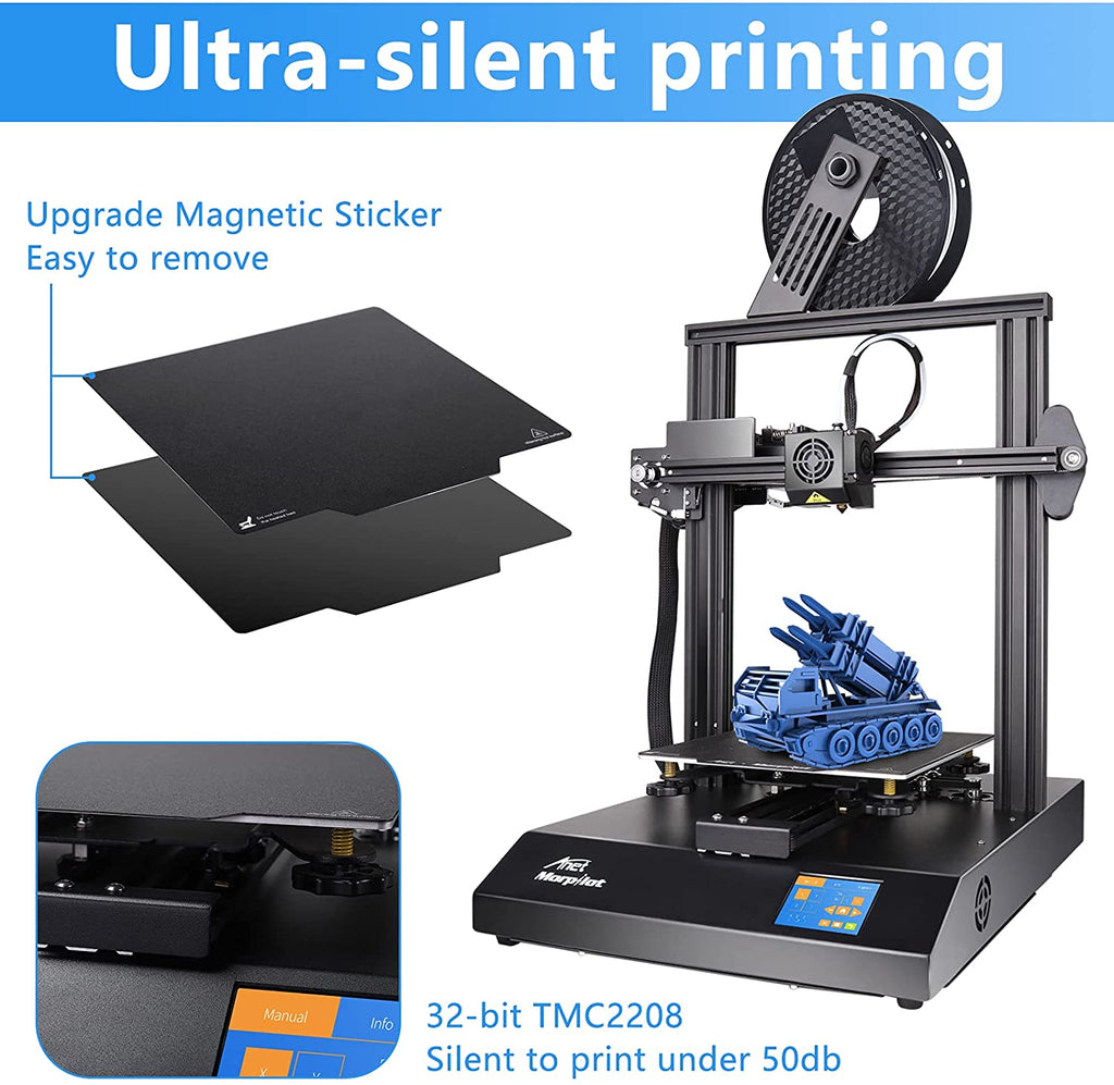 - Auto Filament Detection- Morpilot's 3D Printer can detect when the filament is low and will alert to add more filament, you can load/unload the filament manually or automatically by way of the control panel, it supports most types of filament such as PLA, PLA+, ABS, PETG, etc.