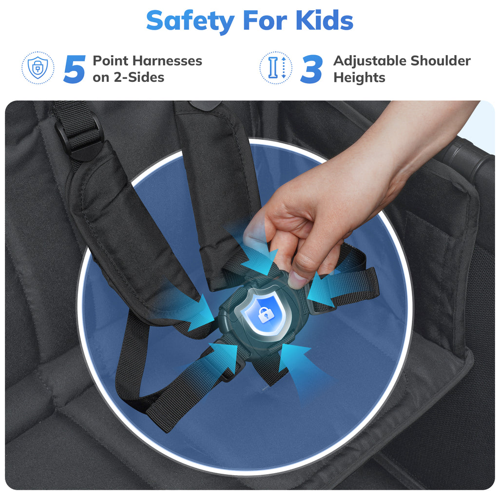 Full-Protection 5-Point Harnesses: SACVON wagon stroller ' s outperforms basic 3-point systems with crash-tested buckles and reinforced anchor points.Single-foot light step on the synchronous locking double wheels, anti-skid parking in one step.