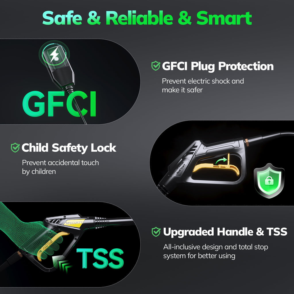 【Smart Energy Saver】:Our high-pressure washer features a Total Stop System, automatically shutting down the electric power when the trigger is released. It restarts with a simple press, conserving energy and extending the motor's lifespan. Efficiency meets performance!