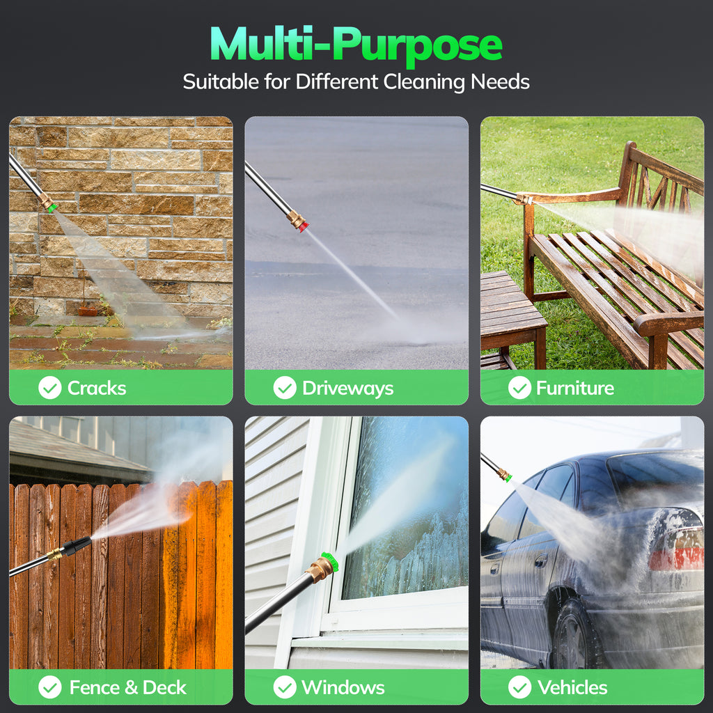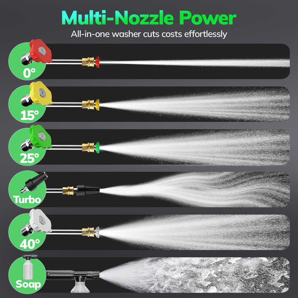 ✅Versatile Cleaning: Our pressure washer comes with 5 interchangeable spray nozzles (0°,15°,25°,40°,Turbo) to suit different cleaning tasks. Use the 0°nozzle for intense spot cleaning, 15°for tough surfaces like driveways, 25°for general use, 40°and turbo for delicate surfaces like windows or vehicles, Switch nozzles in seconds with the quick-connect system.